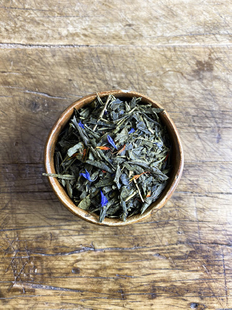 Délicieuse association de thés verts sencha et de fleurs (violette, rose et soucis), avec des pointes dominantes de fruits rouges et noirs. Thé très équilibré et doux.