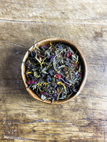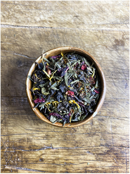 Un thé vert et un thé bleu chinois, un thé vert japonais, ainsi que des fleurs d'hibiscus, un peu de thé rouge sud-africain, et enfin quelques pétales de souci. Un superbe mélange très équilibré, avec un goût léger de fleurs, de gingembre et de cardamome.
